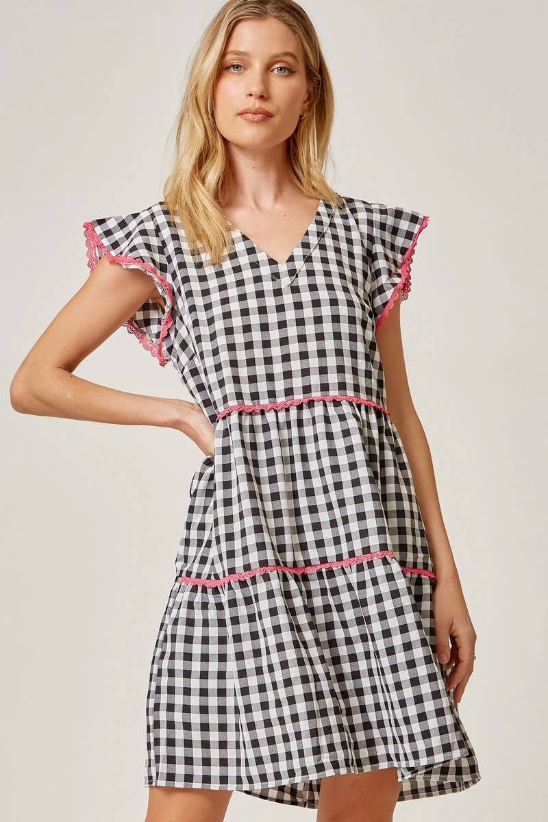 This babydoll tiered dress with hot pink lace details is a beautiful! We love the v neckline and the flutter sleeves! Fully lined. 50% Poly | 50% Cotton