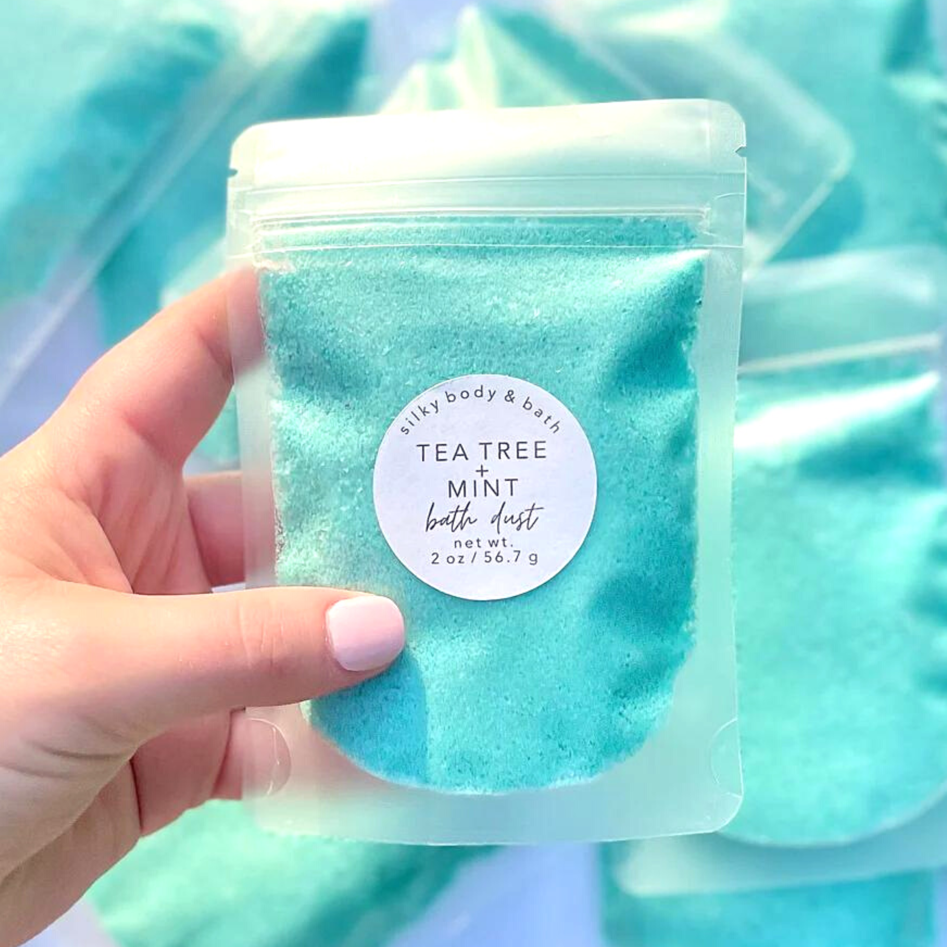 ā Tea Tree + Mint - Teal Bath Dust scented with Tea Tree & Spearmint Essential Oils.
