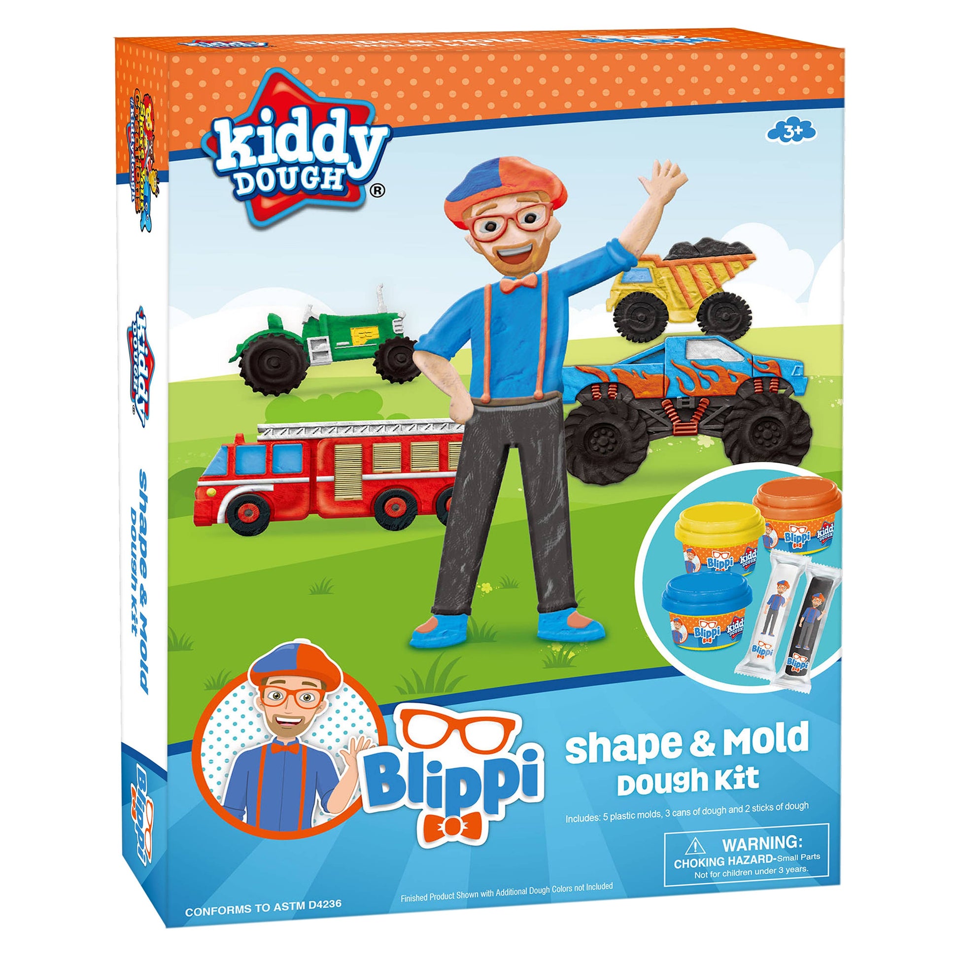 Hey Kids…..It’s me, Blippi! Join me on a car-ific play dough journey where you’ll get to mold awesome trucks & tractors. Use the included 3 dough tubes & 2 dough sticks to sculpt, squeeze & shape a-dough-rable clay creations! You get 4 truck molds & 1 Blippi mold to top off your Blippi dough adventure.