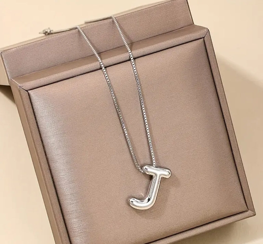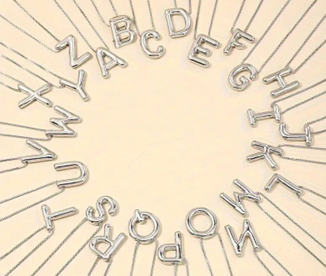 Bubble letter initial pendant necklace in a silver tone color on an approximately 17” chain.