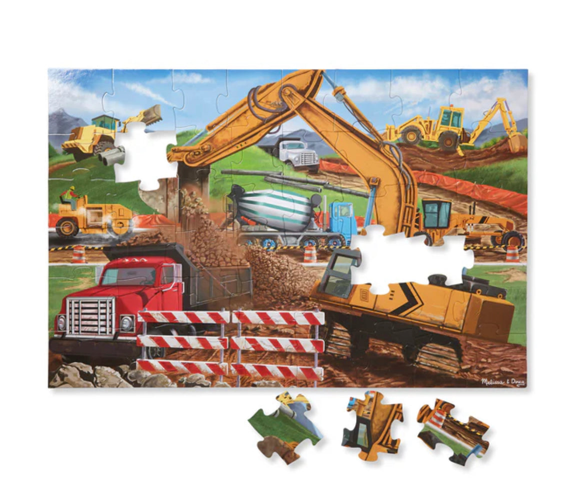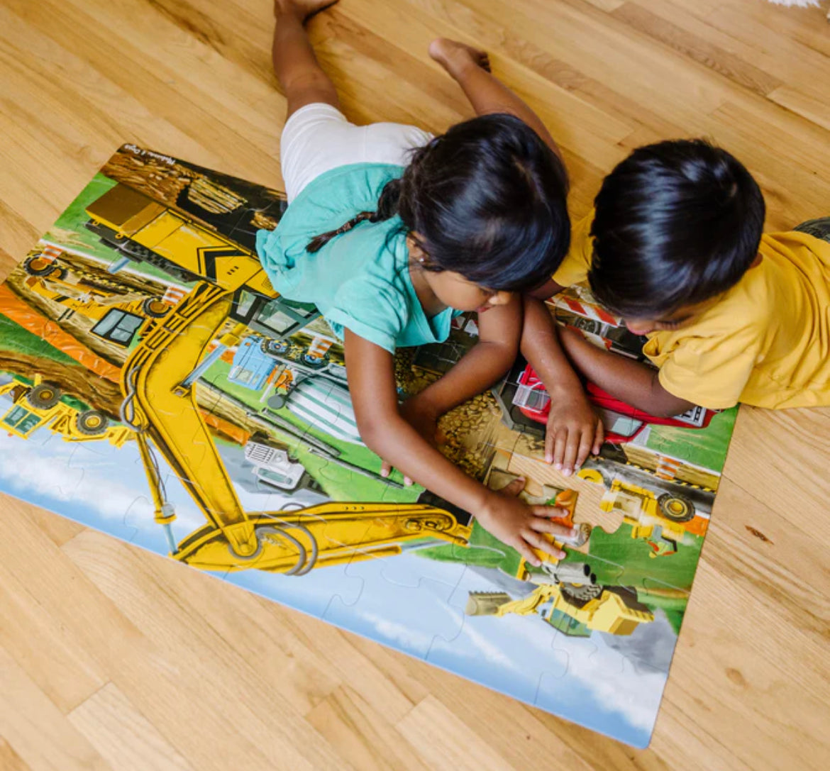 - 2-foot by 3-foot cardboard floor puzzle with a colorful construction site illustration