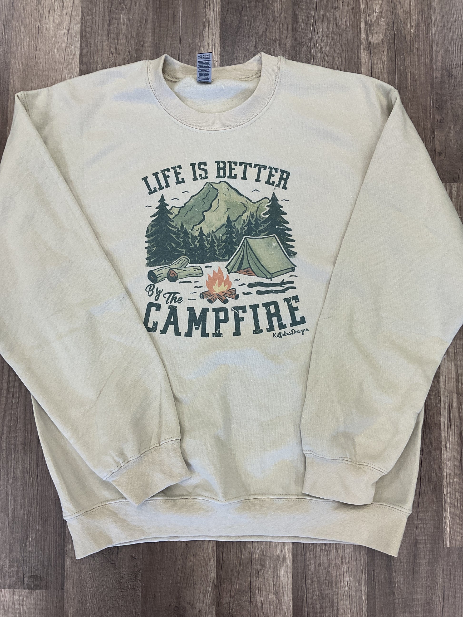 Tan sweatshirt with a camp fire scene that says “LIFE IS BETTER BY THE CAMPFIRE”