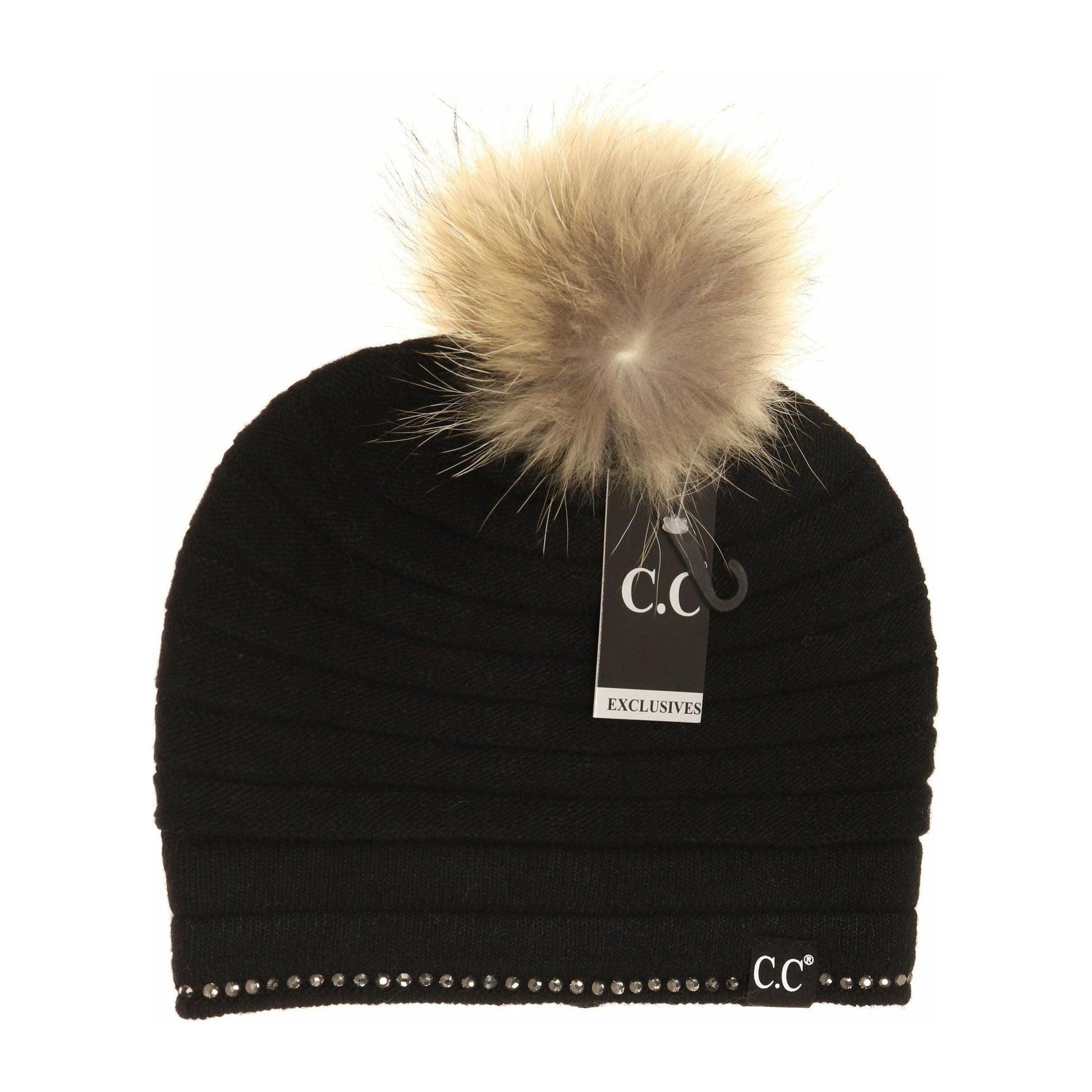 This Exclusive Black Label CC Beanie is so clean and sleek! It has a horizontal ribbed design with a touch of rhinestone sparkle along the edge and a fur pom! This is a definite must have!