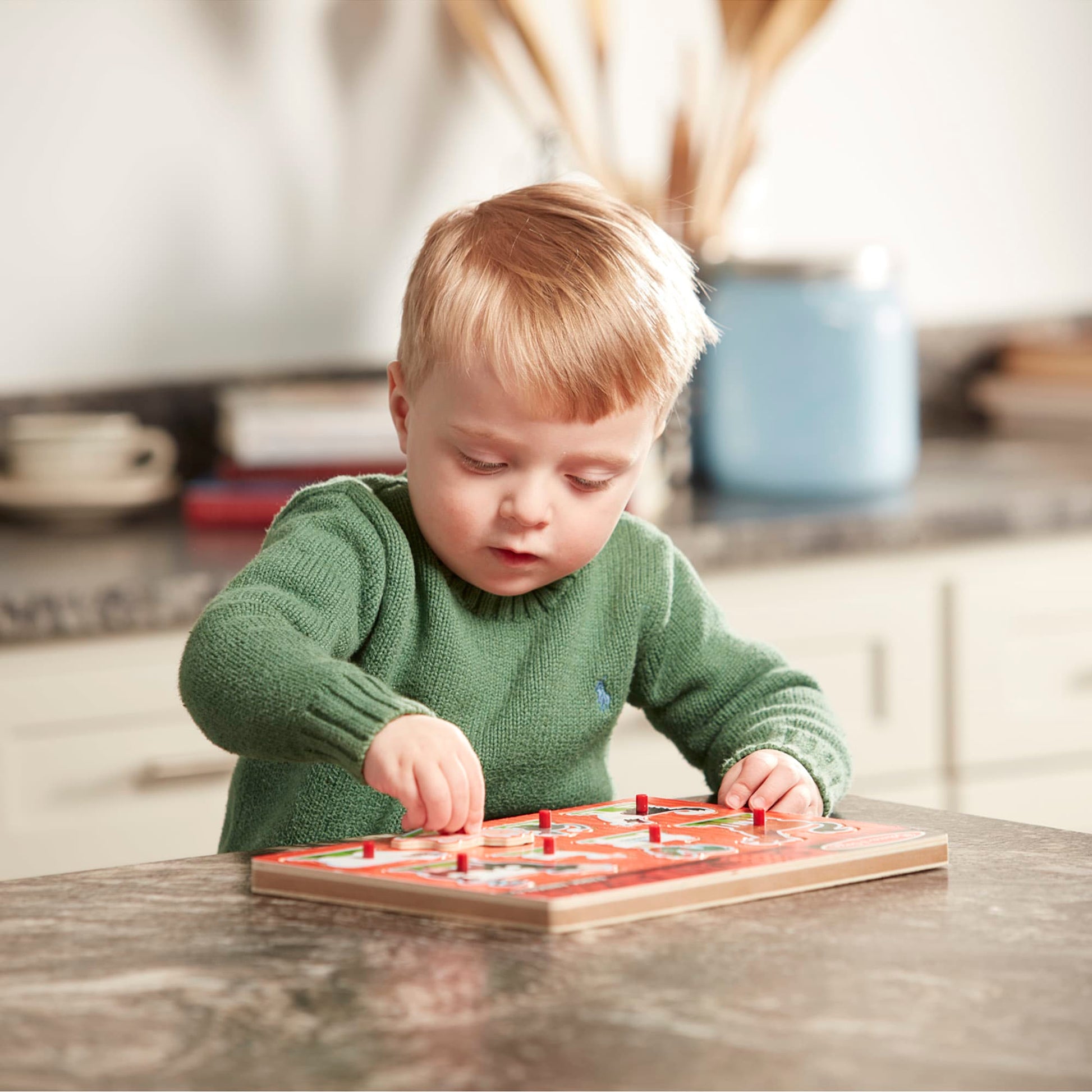- 8-piece wooden peg puzzle with sturdy wooden puzzle board