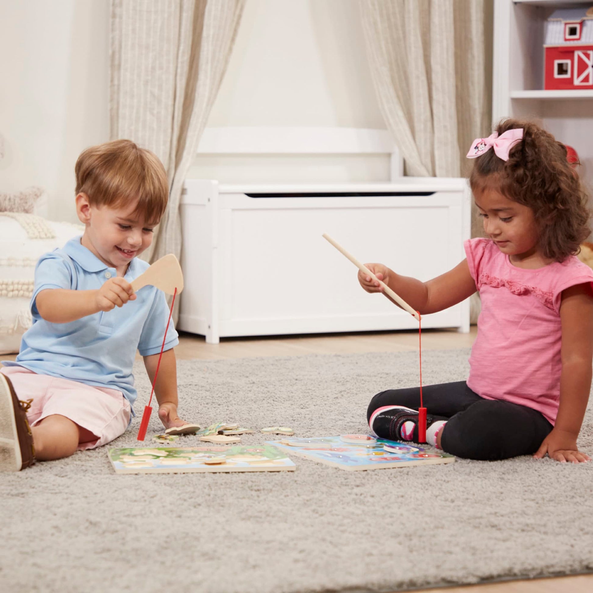 The ultimate catch-and-release fishing program, this magnetic wooden puzzle game features aquatic animal artwork. Use the magnetic fishing pole to "catch" the 10 colorful sea friends from the game board, then enjoy the challenge of returning them to the depths! A creative way to encourage hand-eye coordination and fine motor skills.