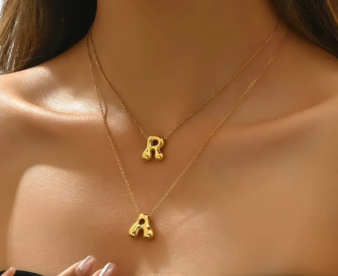 Bubble letter initial pendant necklace in a golden tone color on an approximately 17” chain.