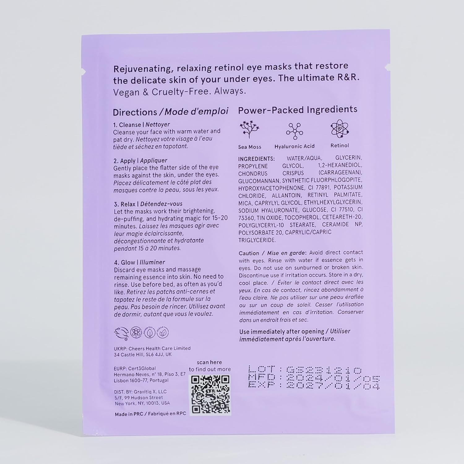 The Ultimate R&R - Eye-bright, overnight with our retinol under eye mask. Packed with magical retinol, known to reduce appearance of fine lines and plump the skin, these anti aging eye patches revitalize tired eyes and restore luminance to your complexion