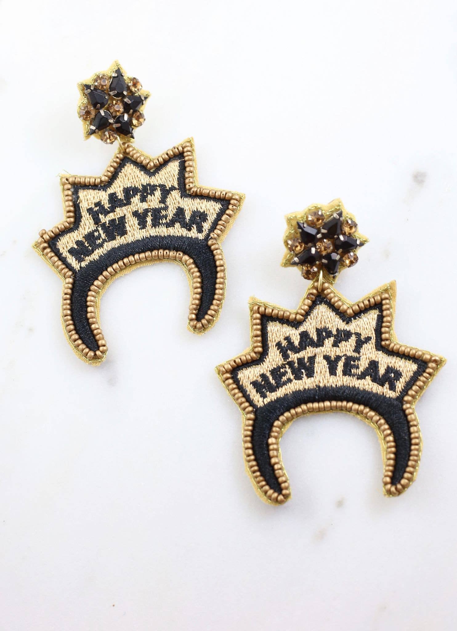This adorable earring is shaped like a fun headband accessory. It is embellished with classy beading and threadwork with an embellished post. The perfect New Year photo op accessory! The back is felt covered as well.