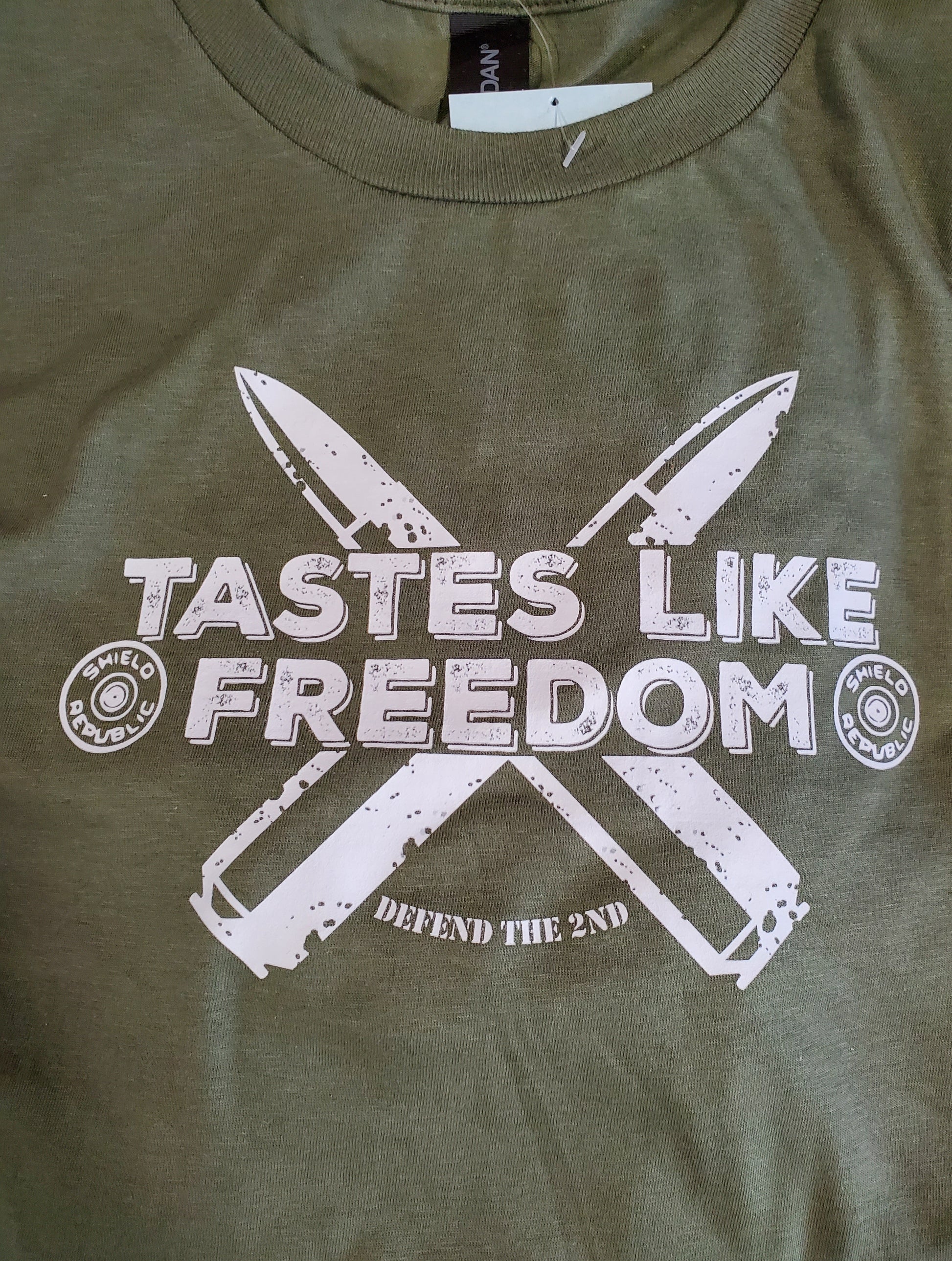 Men’s Gildan Softstyle unisex size t-shirt in Military Green with a Tastes Like Freedom design printed on the front.