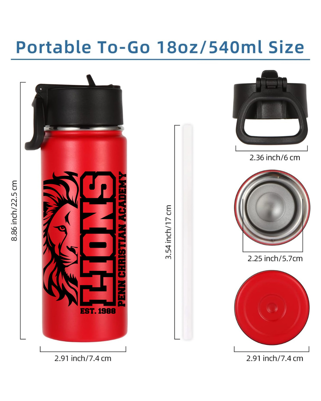 18oz stainless steel water bottle with straw that will have the lions design laser engraved showing a silver stainless steel where the outline of the lion is instead of black. Name can be added to water bottle for $5.