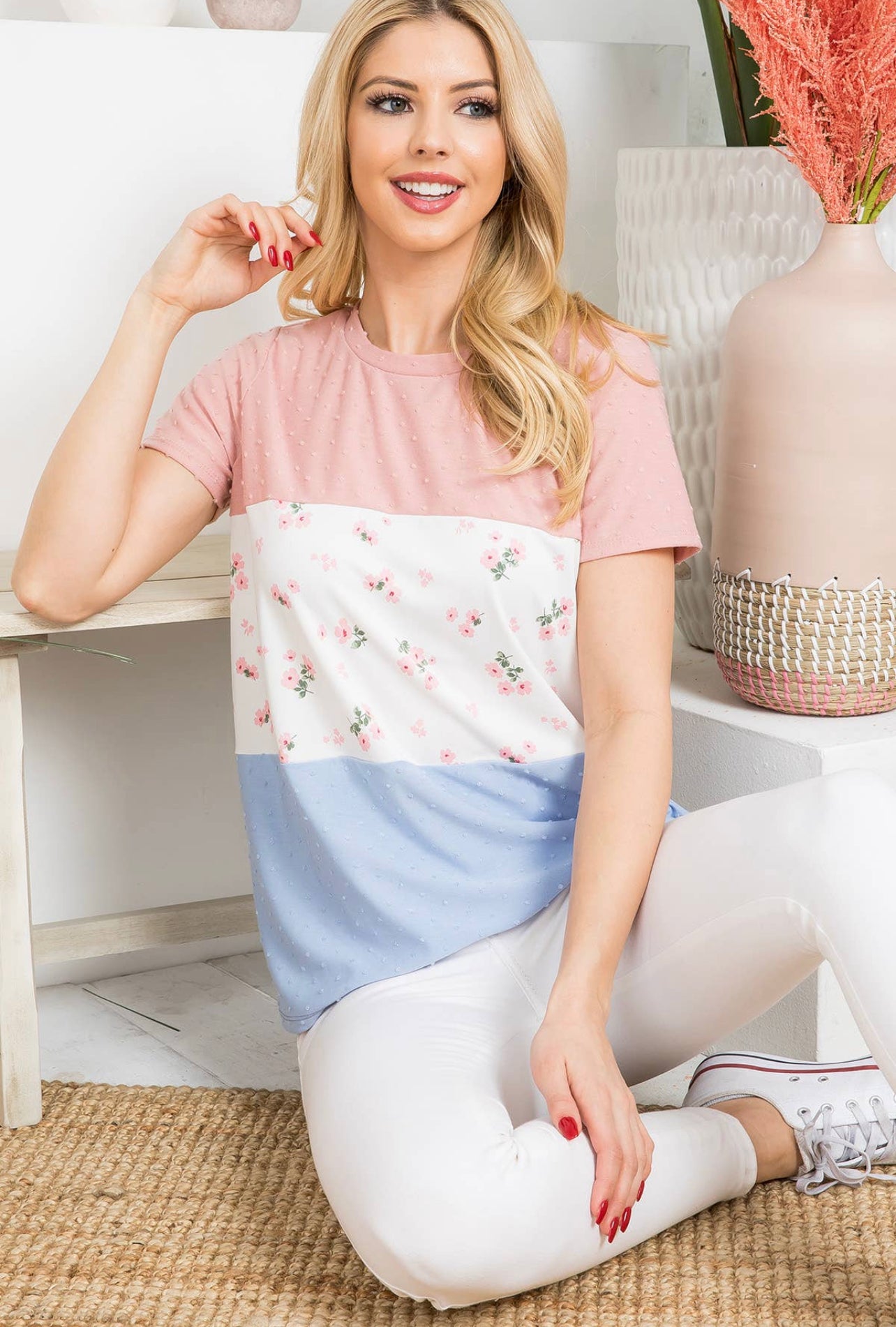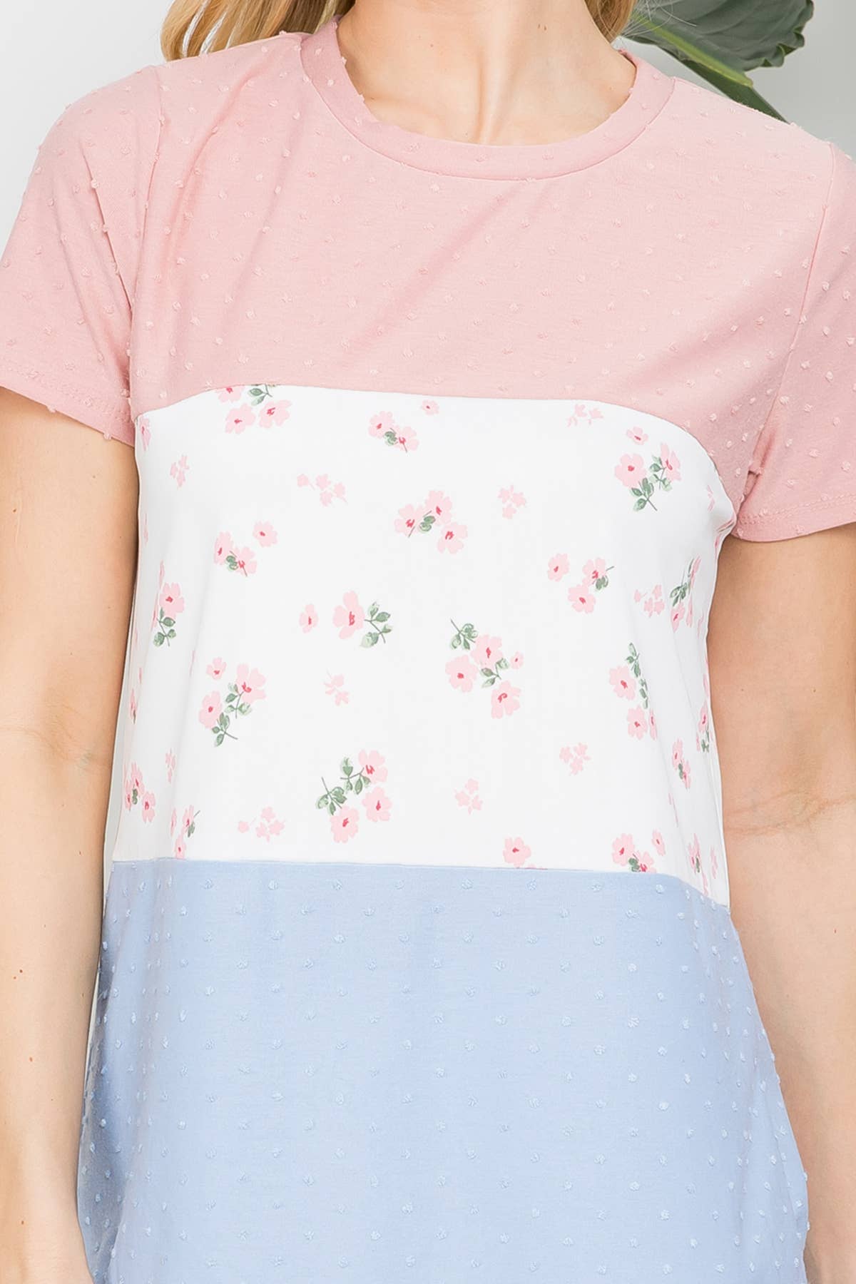 SWISS DOT COLOR BLOCK FLORAL TOP