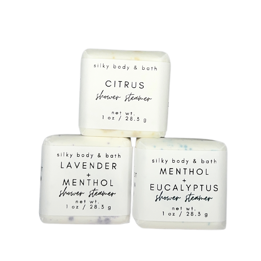 This gift set includes (1) Lavender + Menthol, (1) Menthol + Eucalyptus & (1) Citrus Shower Steamer!